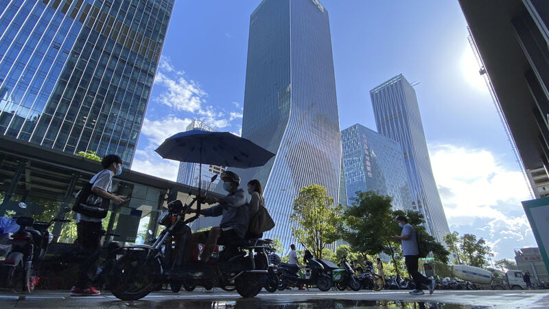 Residents pass near the headquarters for Evergrande in Shenzhen in southern China. Picture: AP Photo/Ng Han Guan