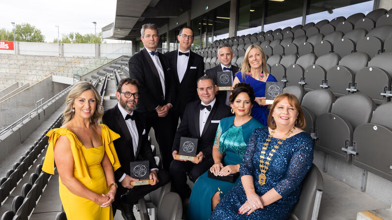 Elaine Collins, Vodafone Ireland; Allan Beechinor, from Altada; Sam Roche Perks, from Simply Blue Group; Jason Hawkins from Carbery Group; CEO of Cork Chamber Conor Healy; Niamh Parker, Altada; President of Cork Chamber Paula Cogan, Kieran Ivers, Green Rebel; and Val Cummins, Simply Blue Group, at the Cork Chamber Cork Company of The Year Awards in Páirc Uí Chaoimh.