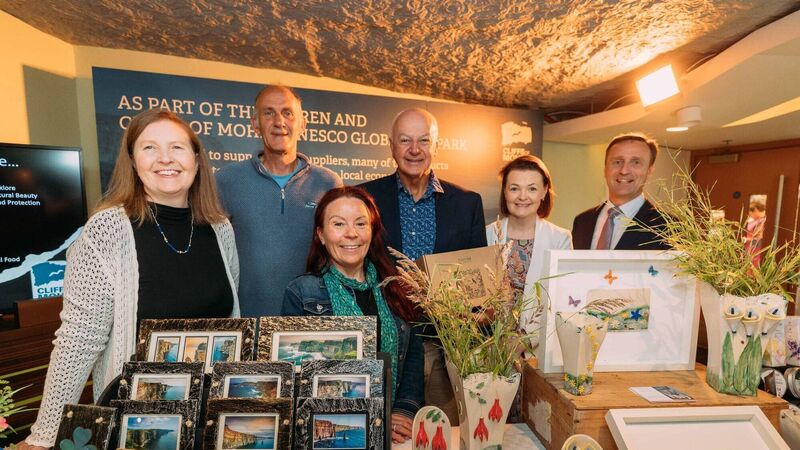Pictured L-R at the Cliffs of Moher Experience: Patricia Farrell of Wilde Irish Chocolates (Tuamgraney); Paul ODwyer of Irish Slate Craft (Lahinch); Raquel Walsh of Creative Clay (Sixmilebridge); Bobby Kerr, Chair of the Board of Cliffs of Moher; Geraldine Enright, Director of Cliffs of Moher Experience; and Leonard Cleary, Director of Rural Development, Clare County Council. Photograph by Eamon Ward
