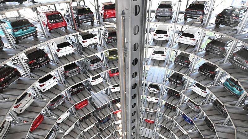 Volkswagen cars stand on elevator platforms inside one of the twin towers used as storage at the Autostadt promotional facility in Wolfsburg. Volkswagen is holding "fair" and "constructive" talks with the United States government on tariffs and wants to make further investments in the country, chief executive Oliver Blume said on Friday. Picture: Stuart Franklin/Getty Images