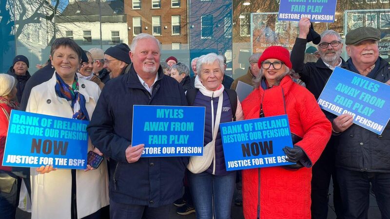 Bank of Ireland retirees protesting outside the bank's South Mall branch in Cork City amid calls to revisit crisis-era pension cutbacks