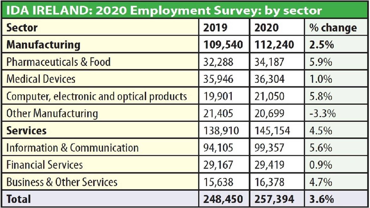 Net FDI employment grew last year by nearly 9,000 jobs to 257,394 despite the negative impact of the pandemic on global investment flows and business activity. IDA client companies now employ 12.4% of COVID adjusted national employment up from 10.7% from the year before. The sectors which performed best in terms of employment in 2020 were the services sector with 145,154 employees, manufacturing with 112,240 and information & communication with 99,357 employees.