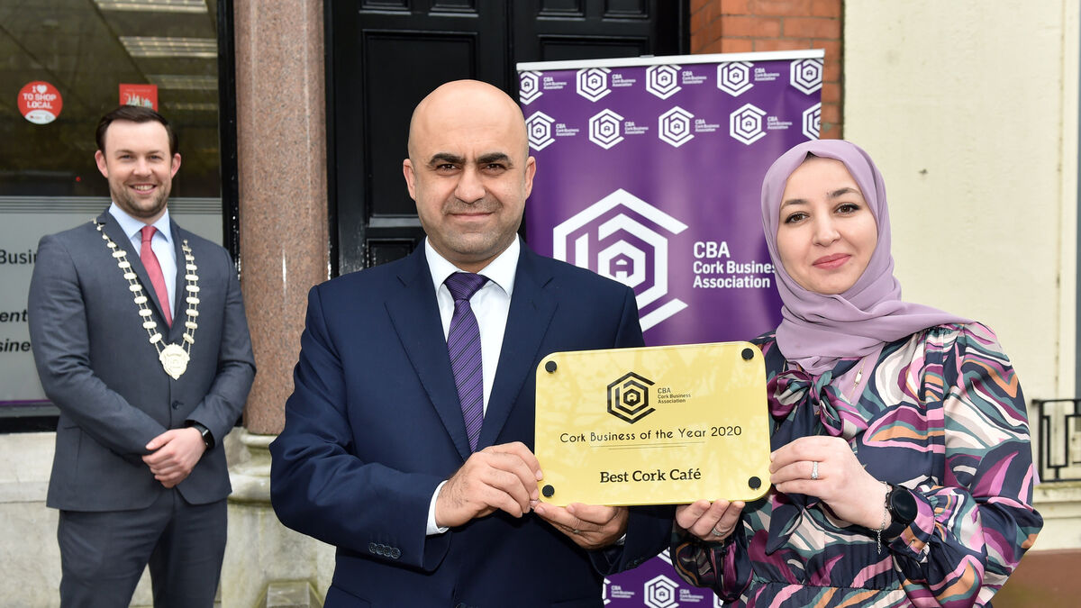 Izzedeen and Eman Alkarajeh, owners of IZZ Cafe winners of the Best Cafe award in the Cork Business Association awards with Eoin O'Sullivan, president CBA. Picture: Eddie O'Hare