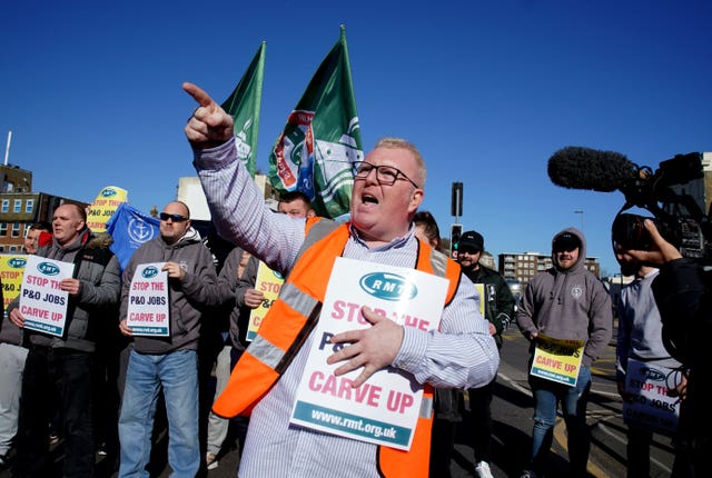 Former P&O staff and RMT union members block the road leading to the Port of Dover after P&O Ferries suspended sailings and handed 800 seafarers immediate severance notices (Gareth Fuller/PA)