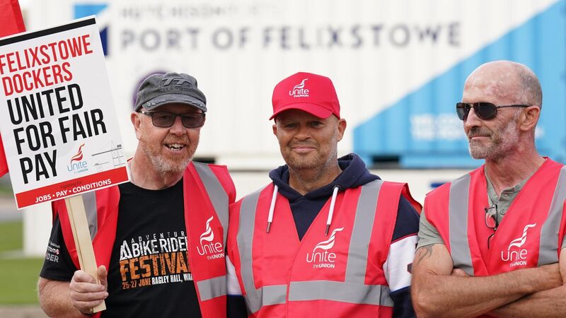 Members of the Unite union at picket line last month at one of the entrances to the Port of Felixstowe, Britain's biggest and busiest container port.Â