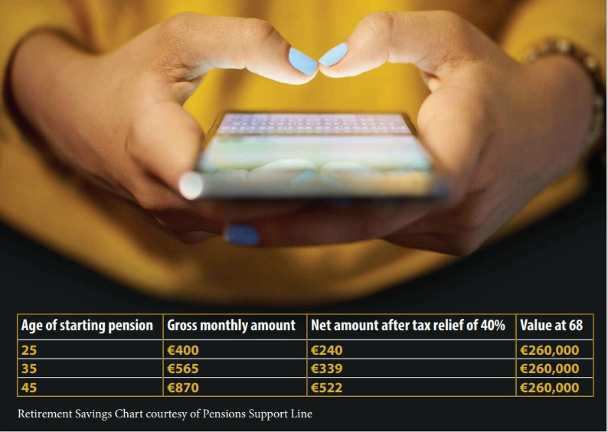 For someone aiming to build up a pension fund of around €260,000, which would give a pension of around €10,600 per annum, Kennedy gives clear advice. He says that the accompanying graphic shows what a person would need to save each month to reach their retirement savings goal, at 68 years of age.