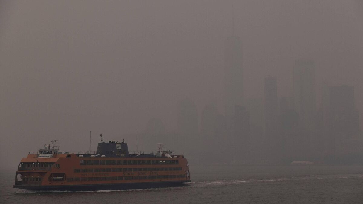A Staten Island ferry passes by Lower Manhattan shrouded in smoke from Canada wildfires in New York, US, on Wednesday, June 7, 2023. The US Northeast, including New York City, will continue to breathe in choking smoke from fires across eastern Canada for the next few days, raising health alarms across impacted areas. Photographer: Victor J. Blue/Bloomberg