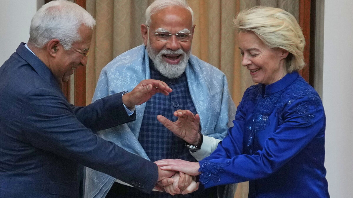 European Council president Antonio Costa with Indian prime minister Narendra Modi and EU Commission president Ursula von der Leyen.
