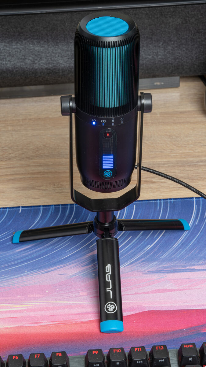 Near the middle of the mic is a mic mute button that lights up green when it’s on and red when muted. Between the mic mute and mode buttons is a level display that lights up green when you turn the gain knob and blue when you turn the volume knob. This looks cool and is extremely handy when you can’t see the knobs around the back but the lights only stay on for 20 seconds after you turn the knob.