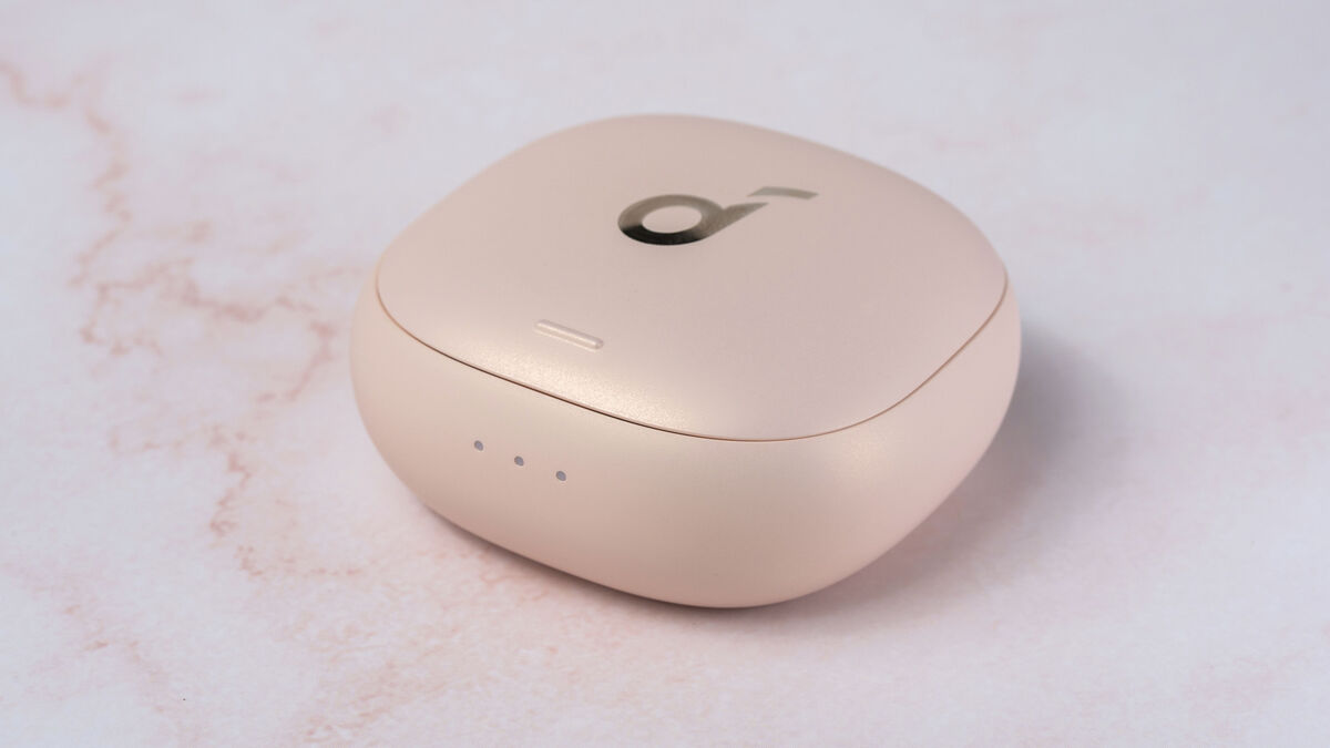 The charging case has a sliding lid with the Soundcore logo adorned on the top. Around the front are three status LEDs for charging and battery levels. The case is square-shaped but with large round corners and a flat base.