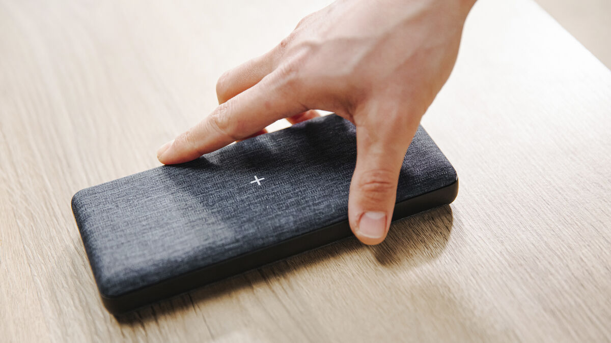 Around the front are three ports including an 18w USB-A (out), 45w USB-C (PD out) and a 100w USB-C (PD in/out). The top and bottom are covered with a fabric material that not only looks great but is also kind to your devices. The top has an Excitrus logo and a ‘+’ symbol screen printed on it in white. The ‘+’ indicates where to place your devices for optimal wireless charging effectiveness. The wireless charging is Qi compatible and also includes support for iPhone 12 and newer MagSafe charging. I found the magnets strong enough to ensure your iPhone won’t slip off the charger even if you’re using a case.