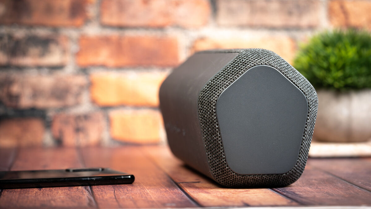 The pentagonal-shaped speaker is stylish and comes in three colours — blue, light grey and black.