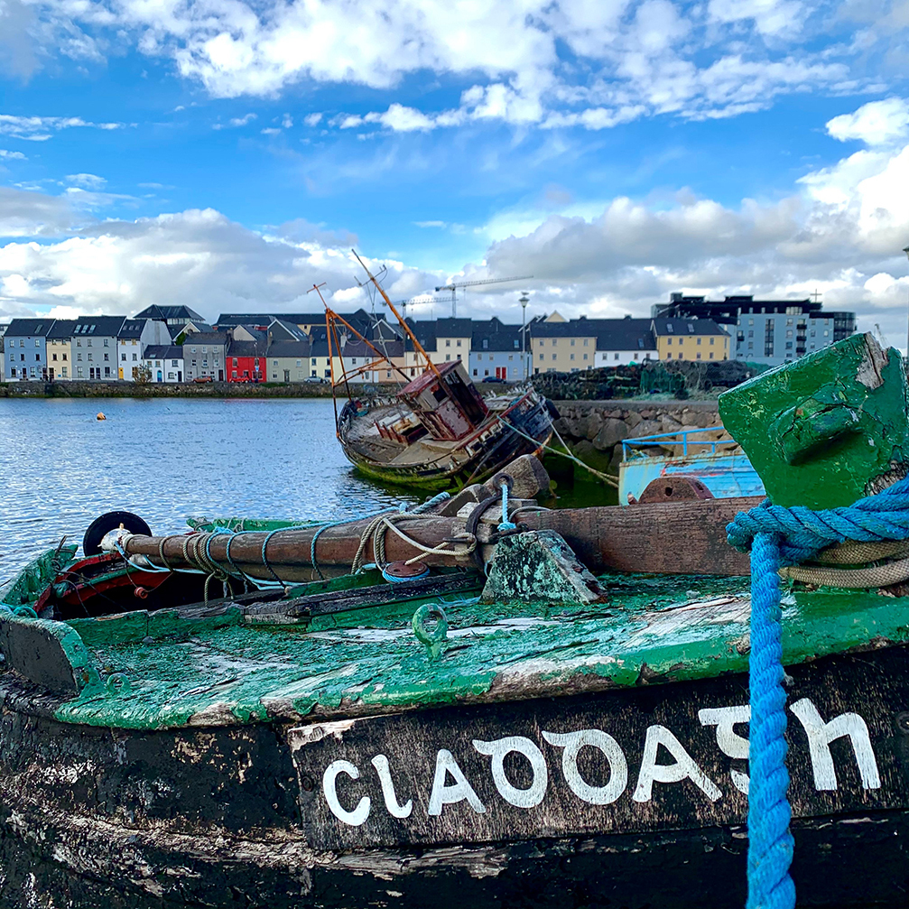 "Taken at Nimmos Pier in one of the oldest recorded fishing villages in Ireland, the Claddagh in Galway dates back to the 7th Century. The ‘Galway Hooker’ boat (pictured) is a traditional boat distinctive to Galway Bay, where fisherman would dock and sell their catch at the Spanish Arch, which is shown in the background. The Claddagh is also famous for the Claddagh ring, which shows a heart with a crown being held by hands. The story tells of a young man that was captured by pirates and sold as a slave to a goldsmith in Morocco, where he designed and made the ring for his sweetheart back in Galway, upon his return"