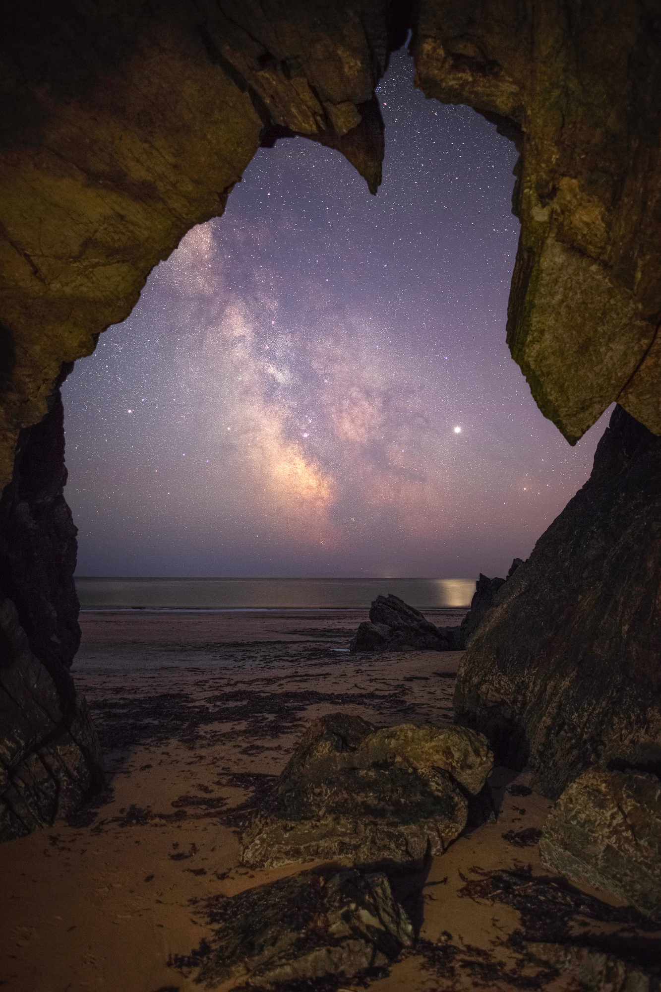 "Dark sky locations in Ireland are few and far between and mostly located in coastal areas. Goat Island in Ardmore, Co. Waterford is an excellent location with Bortle 3 skies out to sea and a clear view South of the summer Milky Way. There are a couple of hidden caves and I lit this one from inside with a low level LED panel and captured the Galactic Core framed by the rock formation of the cave entrance."