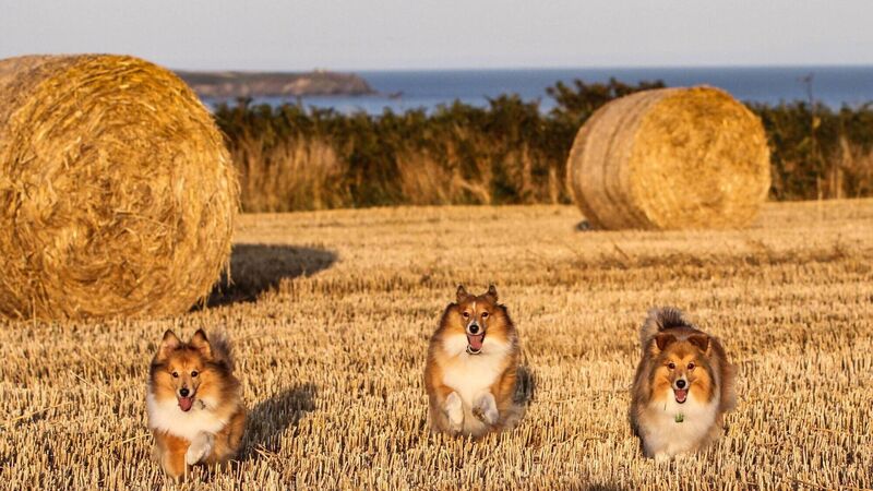 Shetland sheepdogs Bailey, Lassie and Misty enjoying the freedom of the freshly-cut hay fields in Fennell's Bay, Co Cork. Picture: Liz Searls-Spratt.