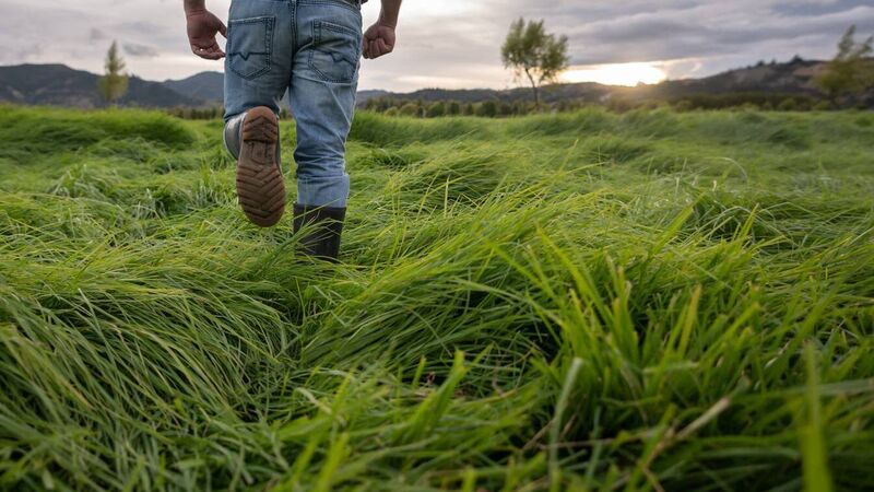 Close-up on a farmer working at a cattle farm and walking around the fields checking the grass
