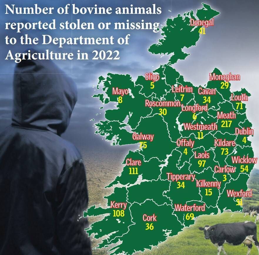 Limerick was the county with the highest numbers reported last year, with 64 bovines recorded as stolen and 245 recorded missing.
