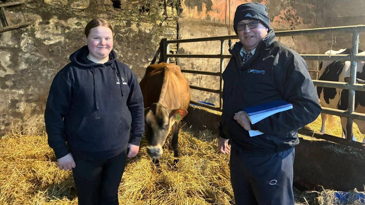 Danske Bank on farm challenge judge Alan Timbrell with Georgie Hynes and their Jersey heifer in milk entry Potterswalls Victorious Cash. Picture: Paula Hynes