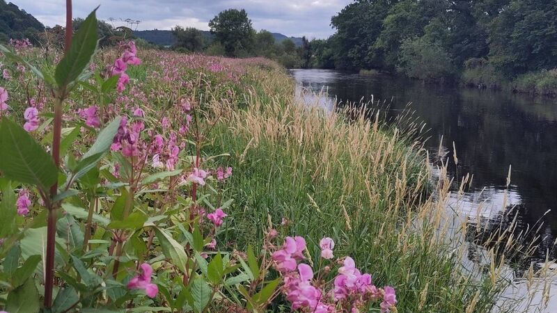 Flowering Himalayan balsam along a riverbank.