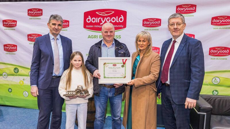 (Left to right) Dairygold chief executive Michael Harte, the Keating family – Kate, alongside Oliver and Margaret - and Dairygold chairperson Pat Clancy. Photo: Peter.p.photos