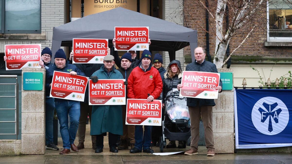 Around 20 members of the Irish Farmers' Association (IFA) protesting outside the offices of Bord Bia in Dublin against a decision not to remove Bord Bia Chairman Larry Murrin from his role. It follows news last week that Mr Murrin's company Dawn Farms has been using some Brazilian beef in its meat products. Picture: Sasko Lazarov/© RollingNews.ie