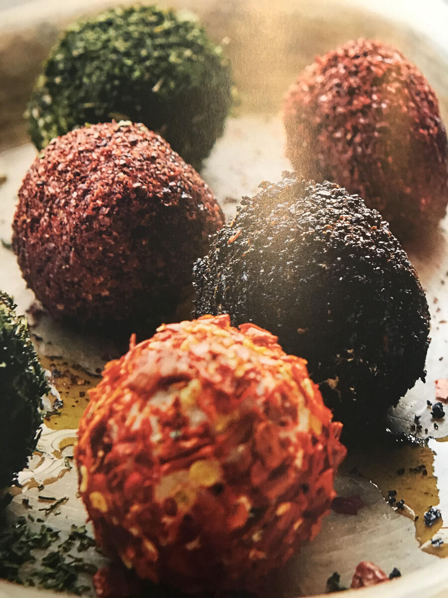 When ready to coat — you can do this up to a day before serving — remove the jar from the fridge and bring to room temperature, so that the oil becomes unset. Lift the balls out of the oil and roll them in the chilli flakes or za’atar: an easy way to do this is to spread your chosen coating on a plate, place a few balls at a time on top and shake the plate: the balls will be coated in seconds. If not eating at once, return them to the fridge on a plate (but not in the oil). Bring back to room temperature before serving: you don’t want them to be fridge-cold.