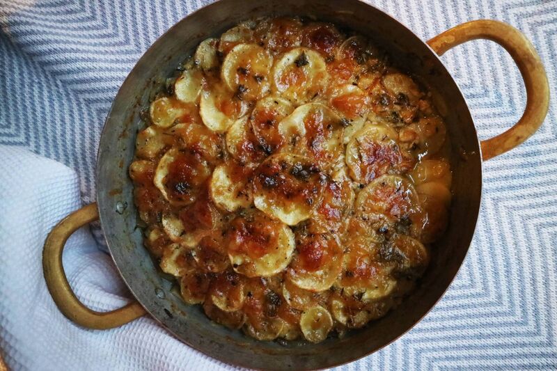 Add the sliced onion and cook until soft and translucent. Take the pan off the heat and arrange the parsnip on top of the onion in thin layers, sprinkling each layer with salt, pepper, thyme and grated cheese. Do this until you have around three layers of parsnip, topped with a final scattering of cheese, thyme and seasoning. Heat the stock in a small pan and pour it over the dish. Cover loosely with a little baking parchment and place in the oven for 30 minutes and then take the parchment off, returning it uncovered to the oven for another 10 minutes to brown.
