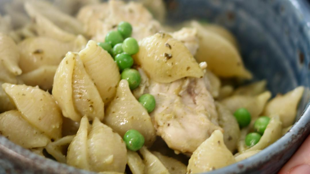 Cook the peas in with the pasta for the last 2 minutes or use the microwave. Both work fine. Once the pasta is cooked, strain and stir in the pesto. Add the peas and cooked chicken. Serve immediately.