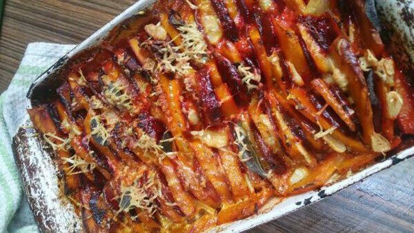 The picture tells the story. In a shallow dish, layer slices of the veg in alternate colours.