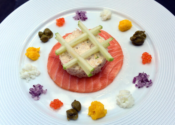 Lay the salmon flat in the centre of the plate, positioning the crab on top of the salmon.