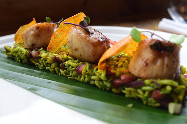 Heat the oil, dust the scallops with gram flour and pan fry them for around 90 seconds each side. Then add butter.