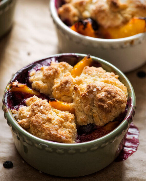 Toss the peaches, orange zest and strawberries in the sugar and place at the base of your ramekin dishes.