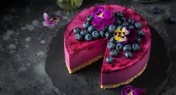 Scoop the mixture onto the base and spread it around to flatten it on top. Place into the fridge to chill for at least three hours. Decorate as you wish before serving. I like to top it with some extra berries and edible flowers.