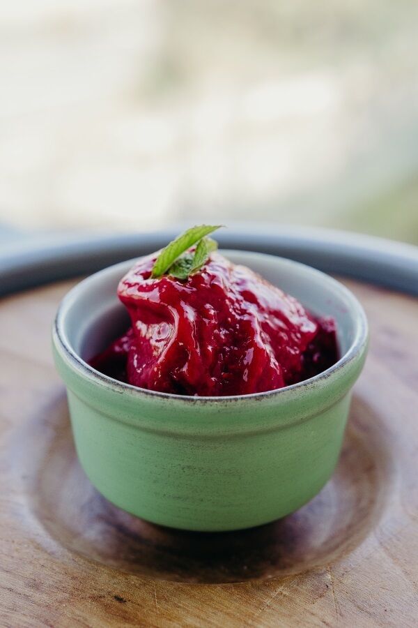 Remove from the freezer after two hours and mix with a fork. Return to the freezer for another two hours. Serve with fresh fruit or as a palate cleanser between courses at a dinner party.