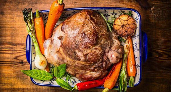Place in the oven and roast for 30 minutes before turning the temperature down to 160C/325F/Gas Mark 3 for a further 3½ hours.