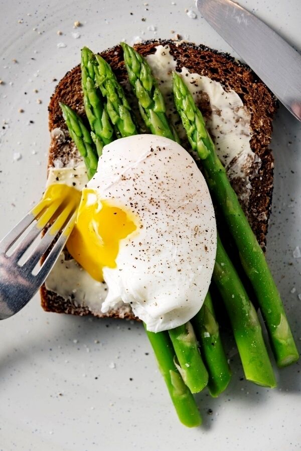 Meanwhile, toast the bread. Slather a little butter on the hot bread and lay 3 slices of cooked asparagus on the base.