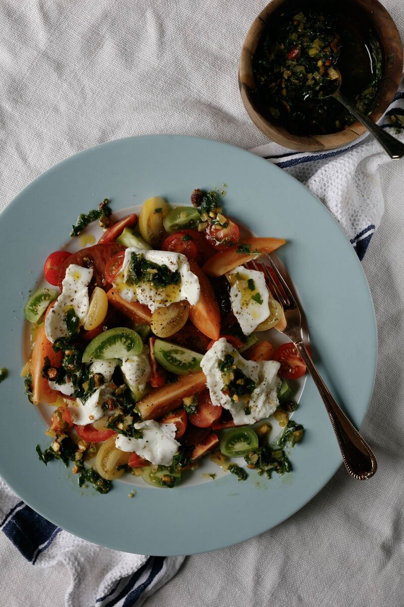 Tomato Caprese with Pistachio, Preserved Lemon, and Sauce Verte