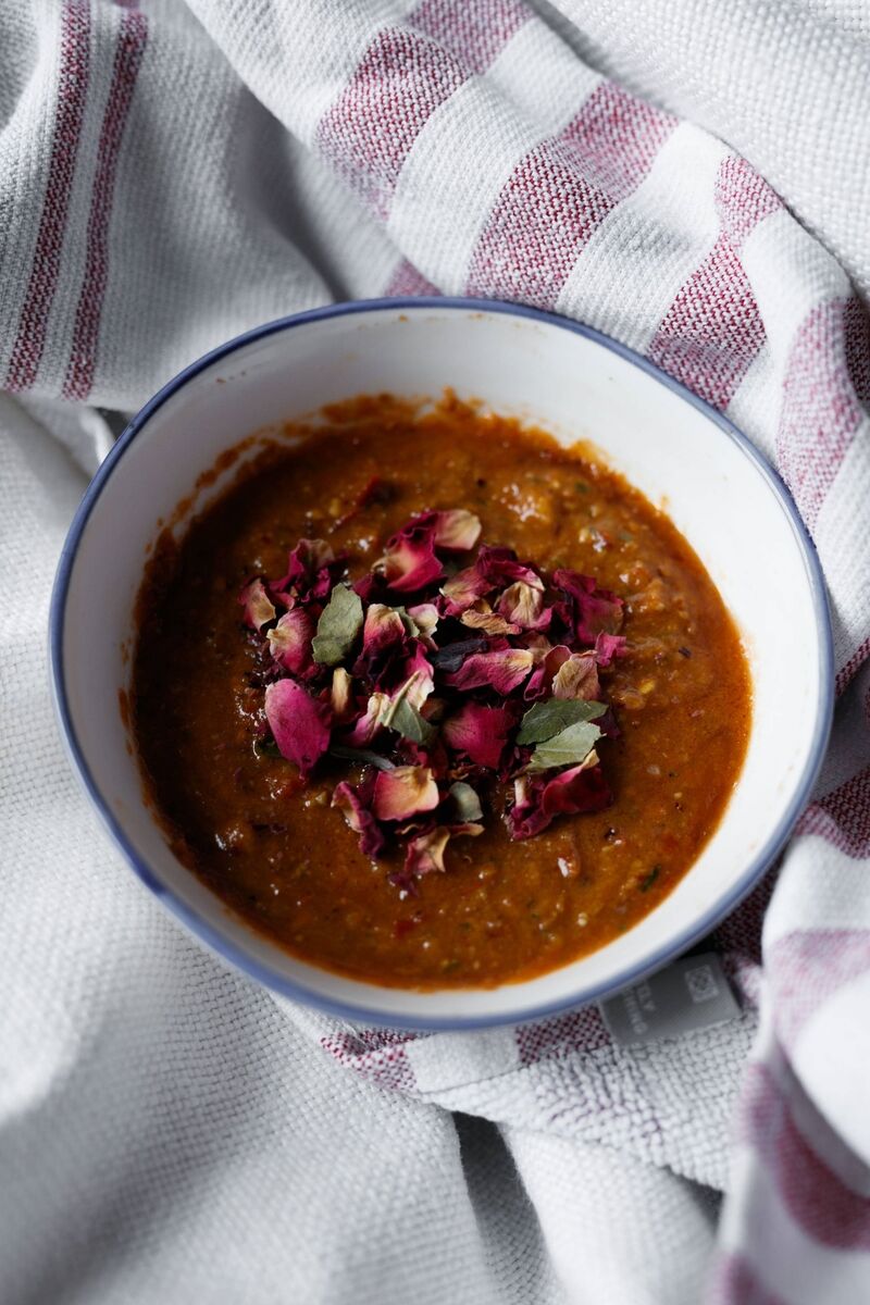 You can remove the tomato skins prior to cooking if you like, but usually don’t bother as everything is blitzed until very smooth. You can make ahead and keep in the fridge. You will be using just 2 or 3 tablespoons of the puree for the harissa.