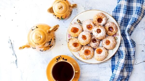 Place them onto the prepared tray leaving a bit of space between each one. When they are all done make an indent in each one with your thumb and fill it with apricot jam.