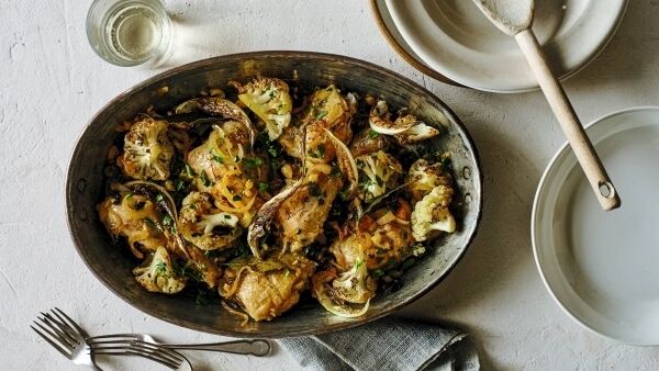 Remove the parchment and roast for a further 10–15 minutes until the edges are nicely caramelised, the cauliflower is tender and the chicken is cooked.