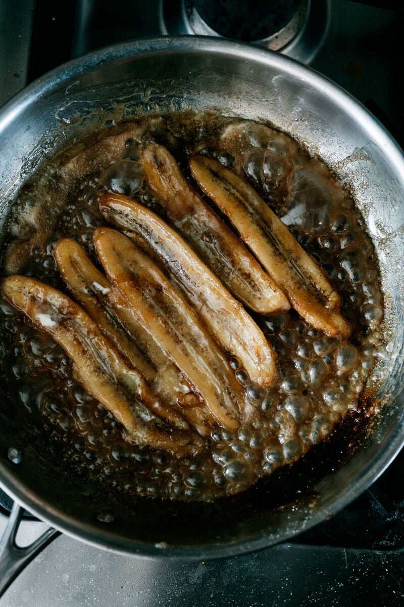 Slice the bananas in half lengthways and place cut side down in the caramel.