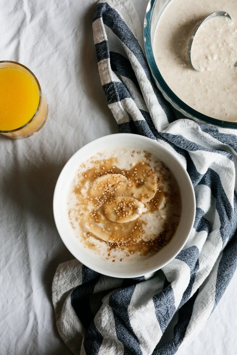 We also like to prepare this with a sort of sweet, nutty sauce, packed with energy to drizzle on top. This can be made the night before as well, leaving you with just the banana to peel and slice in the morning.