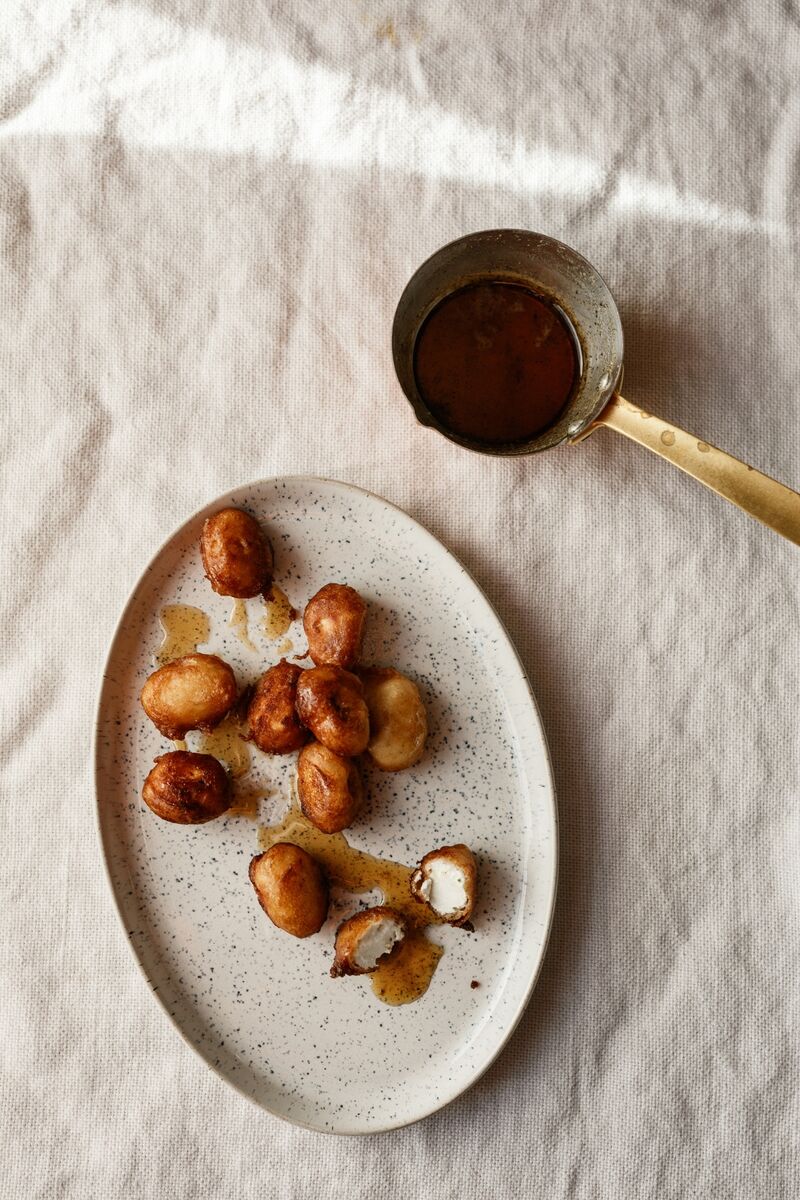 These are such a great snack to have for a cosy night in watching a movie. You won’t need to make too many of these as they are very rich. We usually make around eight of them but feel free to double the recipe if you wish. The goats cheese you use needs to be thick and not too smooth as they need not to fall apart in the batter or frying oil. A good hack is to use those goats cheese pearls you can buy in little cartons of oil.