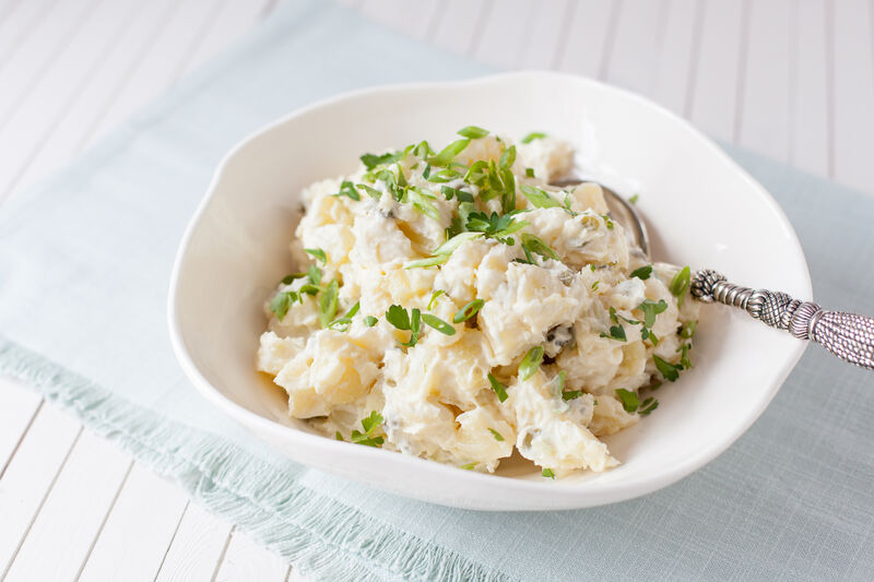 Adding a flavour bomb to your potato salad not only packs a punch but makes it more than something you could pick up in your local supermarket. Consider a snip of chives or spring onions, mint or tarragon to add a herby finish to your salad. If you love a crunch, scatter toasted pumpkin seeds over your salad before serving to add texture and deliciousness.Â
