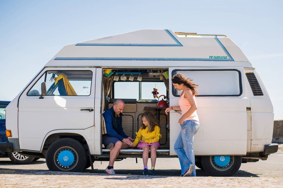 Malachy Duggan, Carrie Budds and their daughter Easkey in their 1990 Volkswagen campervan