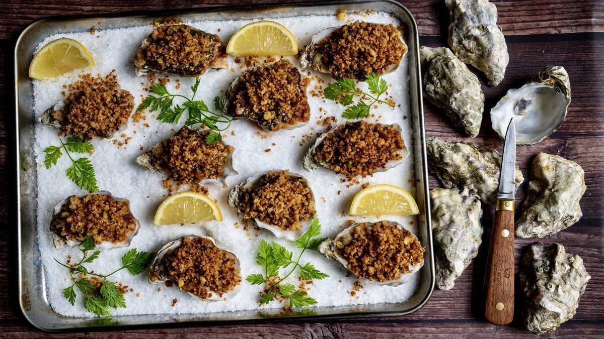 This weekend’s baked oysters with creamy chard and crunchy breadcrumbs is a winner.