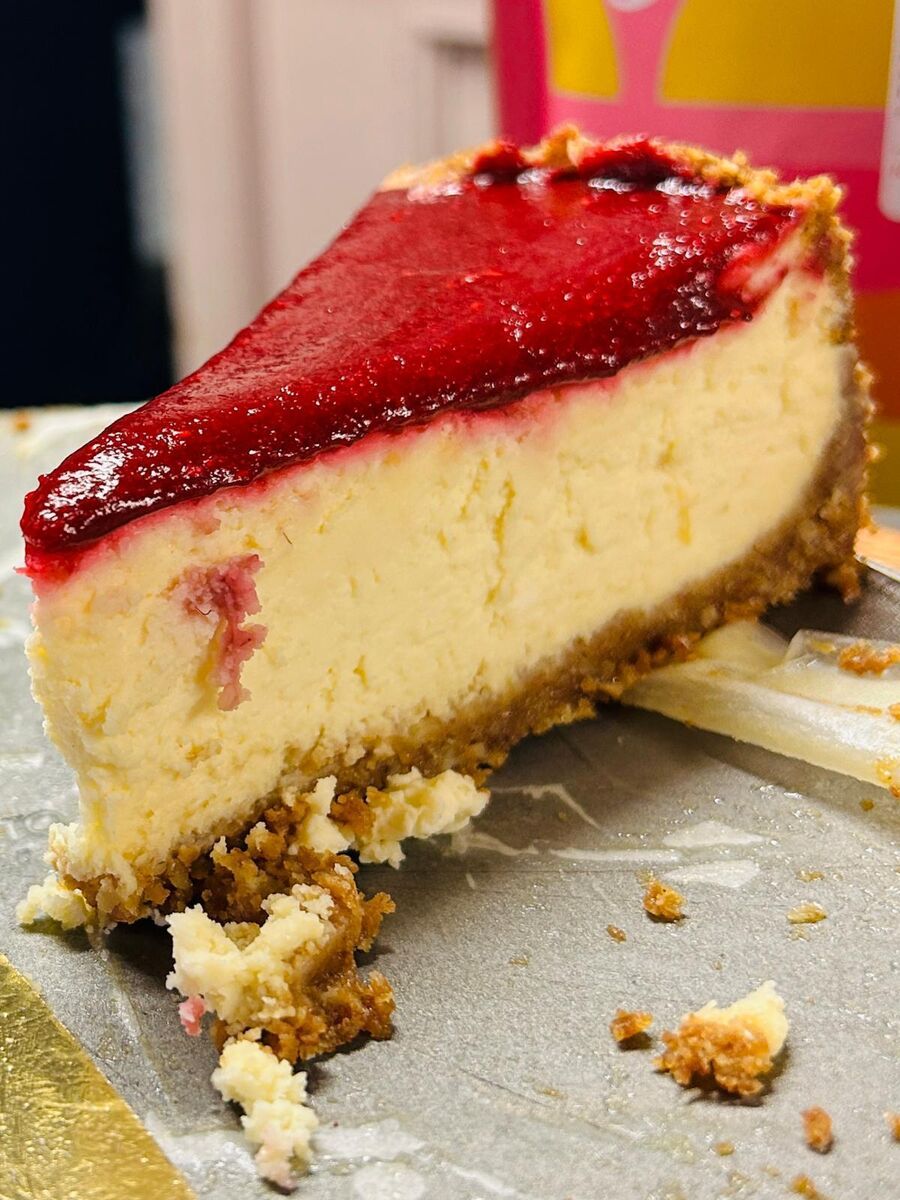 I’m always up for culinary innovation and tasty new creations but my best bite this week was a distinctly old school slice of New York-style baked cheesecake: crunchy sweet-savoury biscuit base, rich cream cheese filling, topped with tart-sweet raspberry coulis.