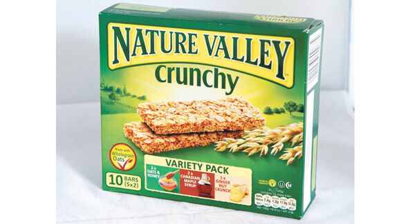 Six individually wrapped bars in a box have a chewy style from a decent quantity of oatflakes and some cornflakes. The dominant flavour is toasty peanut with glucose syrup the first ingredient on the list. There is also condensed milk, dextrose and sugar, so at 27% sugars are high. 8.4% protein, provided in part by the oatflakes and nuts, is quite good. Calorie count is 118 per bar and fibre at 4.1% is moderate. Palm oil is listed on the ingredients. Made in Britain. Fair value.
