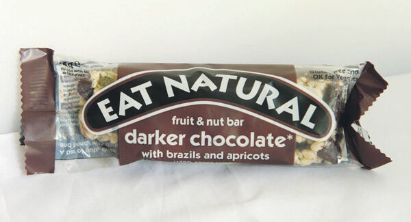 A delicious ‘darker’ chocolate base has 70% cocoa solids, topped mainly with crisped rice mixed with brazil nuts, apricots, dried cranberries, sultanas, pumpkin seeds and shredded coconut. The fruit, nuts and seeds will help keep hunger at bay, but the crisped rice doesn’t add greatly to the nutritional value. With 6.8% protein and fibre at 5.2%, calories at 197 per bar are high. Sugars at 39.5% are very high, partly from the high dried fruit content, but also from honey and glucose syrup. Tasty, it’s also gluten-free. Made in Britain.