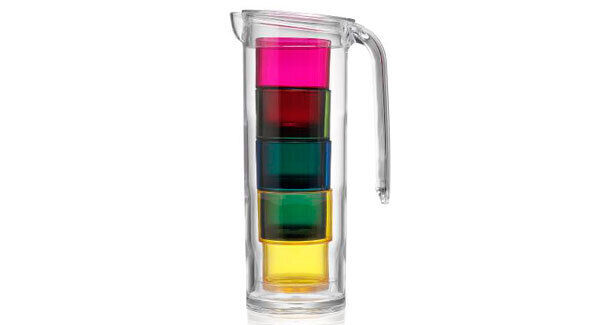 Eye catching and practical when your hands are full entertaining guests. Brighten up the table indoors or out with these stacking tumblers held in a lovely retro jug, M&S, €20